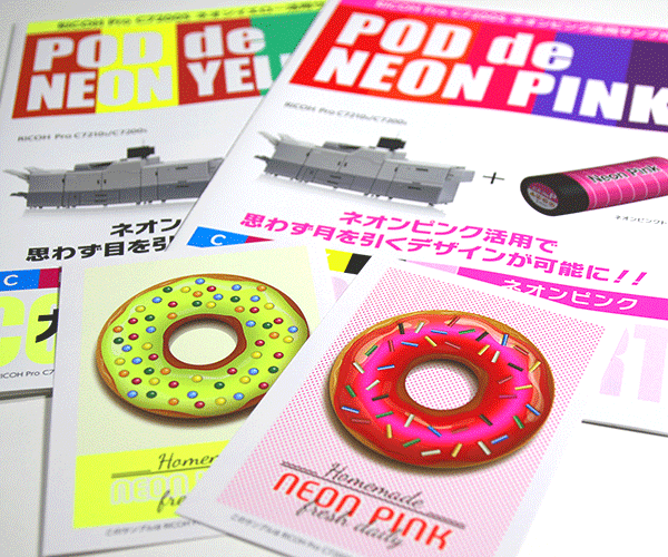 通常のマゼンタ(M紅)やイエロー(Y黄)インクでは表現出来なかった蛍光ピンク蛍光イエローの印刷が出来ます。コミック誌の表紙、ブライダルアイテムやショップカード、ダイレクトメール、招待状などにインパクトのある表現をプラスできます。ブラックライトに反応するのも特長です。※画像はクリックで拡大できます